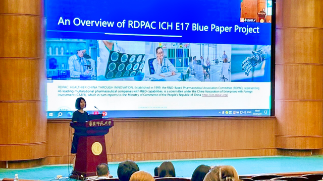 勃林格殷格翰邓红洁博士作主题为“An Overview of RDPAC ICH E17 Bluebook Project”的报告。报告中邓博士系统介绍了RDPAC (R&D-based Pharmaceutical Association Committee)ICH E17 蓝皮书的工作和内容。