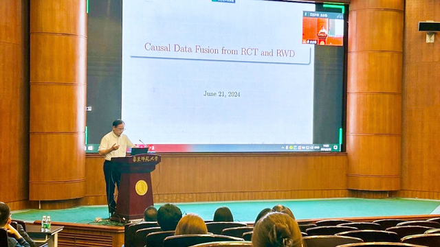 北京大学周晓华教授作主题为“Causal Data Fusion from MRCT and RWD”的报告。周教授在因果推断理论框架下阐述了如何使用观察性研究数据(observational data)来提高随机临床研究(RCT)统计推断的效率,以及推断长期疗效终点结果,包括理论方法,模拟,和实例等。
