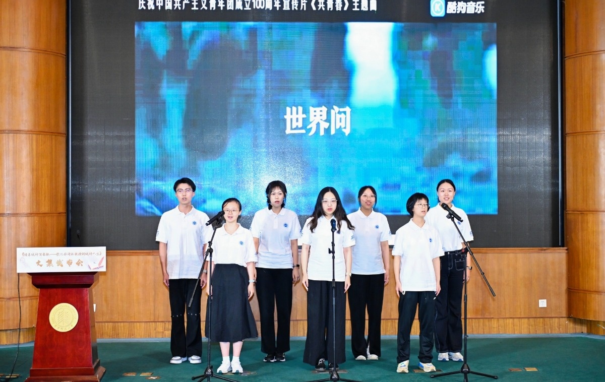 紧接着,来自统计学院的五位学生代表——毛莉娜、张津赫、孙钰涵、梁凡、柴一又,用他们青春洋溢的声音朗读了文集中的精彩片段,展现了年轻一代对茆诗松教授学术精神的深刻理解与传承。他们的朗诵不仅表达了对茆诗松教授的深切怀念,更传递了统计学人不断进取、勇于探索的坚定信念。