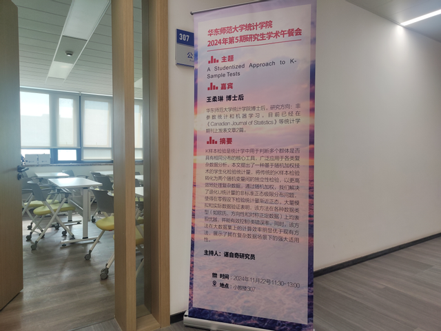 11月22日中午,统计学院在小教楼307教室成功举办了2024年第5期研究生学术午餐会。本次午餐会特邀统计学院的王柔琳博士后作为主讲嘉宾,她的研究领域聚焦于非参数统计与统计机器学习,为与会者带来了题为“K-Sample Studentized Nonparametric Test”的精彩学术报告。本次活动由统计学院谌自奇研究员主持,吸引了三十余名硕士及博士研究生积极参与。