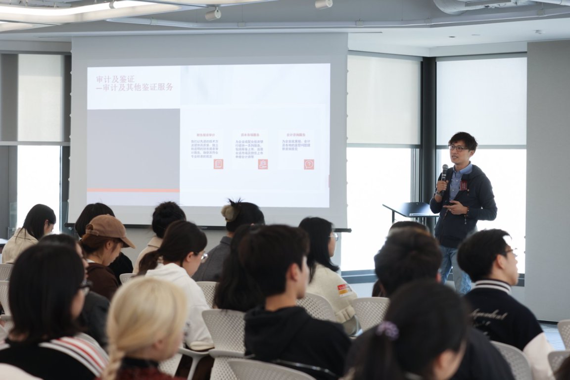 其中,普华永道华中地区校园招聘负责人Rebecca Chen向大家系统介绍了公司的主要业务方向,包括审计与鉴证服务、风险控制、税务咨询与管理咨询等。通过分享与电商运营、新能源汽车、跨境交易等客户的真实合作案例,Rebecca展示了企业如何为不同行业客户提供量身定制的专业解决方案,帮助客户在数字化转型、全球化运营背景下中提升竞争力。同学们也进一步理解了企业服务的广度与深度,对专业知识的实际应用场景有了更加直观的感受。