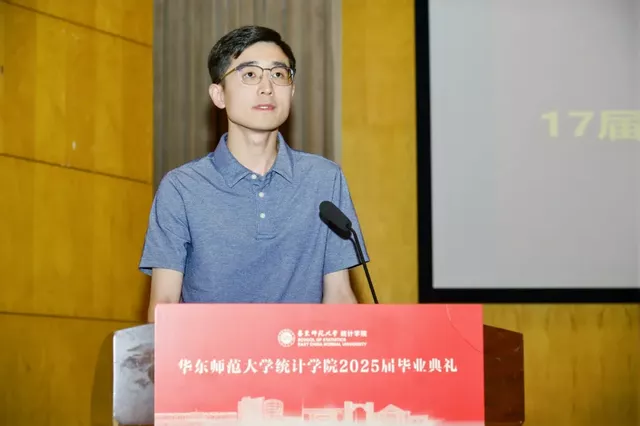 在典礼现场,教师代表,2025年度“学生心目中最优秀教师奖”获得者姚强老师以一场温情满满的“最后一课”,为毕业生们送上真挚的祝福。姚强巧妙地将“马尔可夫过程”“平稳过程”“增过程”等专业概念融入其中,赋予它们别样的人生寓意。他寄语同学们:愿你们在充满不确定性的岁月中,依然保持内心的平稳与热忱,心中始终保有一份“向上的均值”。愿大家带着统计学的理性智慧与浪漫情怀,勇敢奔赴属于自己的崭新旅程。