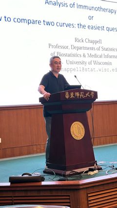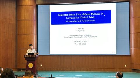 在报告环节,来自国际顶尖学府与知名药企的专家们带来了精彩分享。美国威斯康辛大学麦迪逊分校 Richard Chappell 教授以 “Analysis of Immunotherapy Trials” 为题,结合实际案例分享研究经验与前沿成果;约翰霍普金斯大学 Chen Hu 教授围绕 “Restricted mean time related methods in comparative clinical trials”,,为临床研究的统计设计提供了新思路,与会者踊跃提问,展开了深度学术交流。