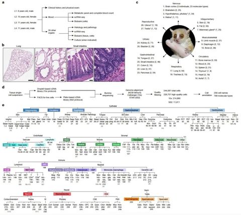 文章利用单细胞测序技术针对新兴的灵长类模式生物小鼠狐猴开展研究,分析了27个组织器官的22.6万个细胞,通过细胞聚类、整合和注释方法,定义及整理出了750种细胞类型及其完整的基因表达谱,构建了小鼠狐猴细胞图谱。通过对表达谱的全面比较研究,深入探索了灵长类细胞类型的进化,揭示了灵长类特化的细胞类型特异性模式,以及许多在研究中鼠狐猴比小鼠更适合作为人类模型的细胞类型和基因。此外,通过研究小鼠狐猴的基因、生理特征、疾病和基因突变情况,发现了数千个此前未被识别的狐猴基因以及数十万个新的剪接位点,绘制了免疫细胞的发育、迁移和激活图谱,系统地探究了狐猴的免疫系统。文章还对灵长类特有的和狐猴特有的生理特征与疾病进行了描述,包括免疫程序的分子特征、狐猴脂肪细胞以及类似于人类恶性肿瘤的转移性子宫内膜癌,展示了400多种在小鼠中缺失的灵长类基因的表达模式,其中许多基因的表达模式与人类相似,还有一些与人类疾病相关。这项工作为鼠狐猴的分子和遗传学分析奠定了基础,并为未来对灵长类基因、亚型、生理特征和疾病的研究确定了优先方向。
