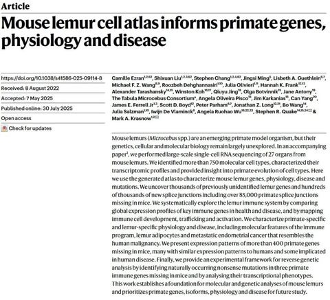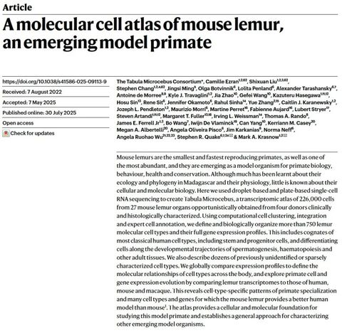 近日,国际顶级期刊《Nature》(正刊)刊登了华东师范大学统计学院和统计交叉科学研究院明静思副教授与美国斯坦福大学、香港科技大学等高校学者合作的两篇研究成果:A molecular cell atlas of mouse lemur, an emerging model primate和Mouse lemur cell atlas informs primate genes, physiology and disease。