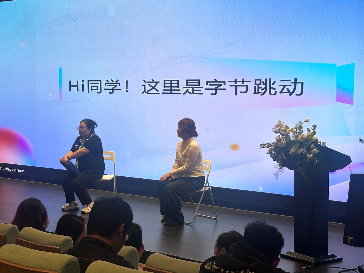 当天下午14:30,同学们陆续抵达抖音新江湾广场。伴随轻松开放的工区氛围,在字节跳动校招经理刘老师的引导下,参访正式开启。刘老师从字节跳动的创业故事讲起:从今日头条、抖音、番茄小说,到飞书、巨量引擎,再到底层的OceanEngine算法系统、火山引擎云服务平台,每一项产品背后都是“技术推动内容、数据驱动决策”的理念落地。其中,通过字节跳动创业初期的VCR,我们可以发现“与优秀的人,做有挑战的事”不仅是字节的人才观,也是其产品迭代、技术突破与业务增长背后的底层逻辑。务实、追求效果、保持好奇,是这家公司最鲜明的文化特质。