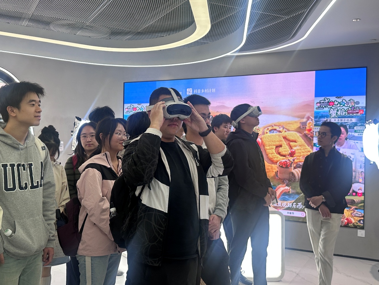 在参访的核心环节——字节跳动展厅,同学们看到了这家企业更立体、更具温度的一面。大家依次体验了公司前沿产品。在抖音电商直播间的即时互动逻辑里理解算法如何匹配供需,在豆包AI的音乐生成能力感受AI创造力的边界拓展,在字节跳动参与的古籍修复公益项目看见技术与文化传承的结合,在全新的VR设备里体验未来交互方式。这不仅是产品展示,更是一次关于“内容产业如何演化”“数据如何驱动创新”的现场课程。同学们第一次如此近距离地感受到:互联网企业不是抽象概念,而是由技术、创意、工程和责任共同构建的巨大生态系统。