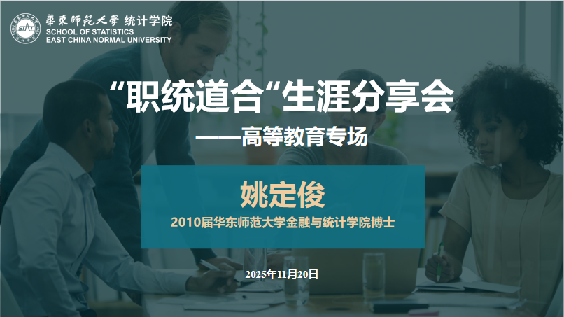11月20日下午,为帮助学生明晰职业发展方向,特别是深入了解高等教育领域的职业路径与要求,统计学院职统道合生涯分享会特邀我院优秀校友、南京财经大学金融学院教授、副院长姚定俊担任主讲嘉宾,与近二十位有志于在学术领域发展的本硕博同学相约理科大楼A302。